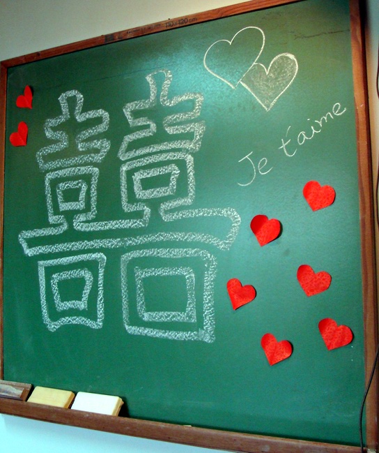 重頭戲當天,早上先在神廳舉行訂婚儀式,中午移往附近的會場吃喜酒。這是神廳旁寫上囍字的黑板,因為未婚夫來自法國,也應景地寫上法文。